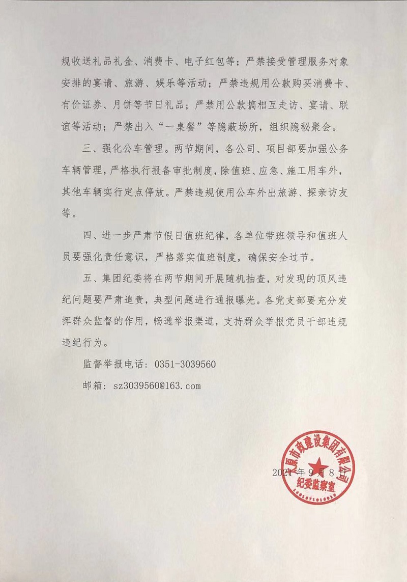 太原市政建設(shè)集團有限公司關(guān)于嚴明“中秋、國慶”期間有關(guān)紀律要求的通知