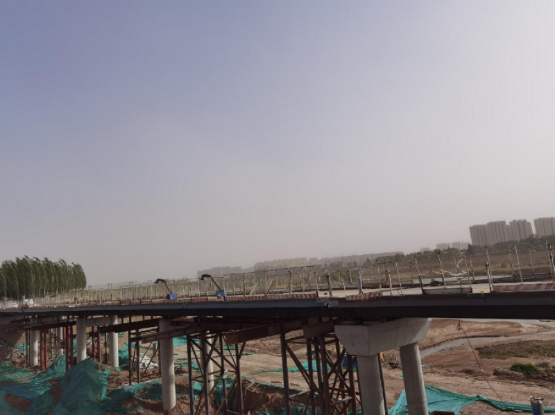 濱河?xùn)|路南延二期工程施工一標(biāo)段北起迎賓路,南至設(shè)計(jì)樁號(hào)K5+500,道路全長(zhǎng)約5.3公里,設(shè)計(jì)紅線寬為51.5-60米,施工內(nèi)容包括人行地下通道、排水、電力、下穿通道、高架橋、道路工程,于2021年12月開(kāi)工建設(shè),由一公司、三公司共同承建。該工程作為市重點(diǎn)項(xiàng)目,一公司強(qiáng)效組織、積極籌劃,確立“精心組織、精準(zhǔn)對(duì)標(biāo)、精細(xì)管理、精致施工”的理念,采取“分段管理”的施工方案,確立七個(gè)工區(qū),并安排專人負(fù)責(zé)各工段,形成全面開(kāi)花、相互協(xié)作的工作局面,大力提高施工效率。施工中,項(xiàng)目部錨定目標(biāo)節(jié)點(diǎn),制定施工計(jì)劃,冬季施工中認(rèn)真做好混凝土養(yǎng)護(hù)和保溫工作,有效防止混凝土凍裂;采用放坡和拉森鋼板樁+鋼支撐的支護(hù)方式,嚴(yán)格控制鋪筑厚度逐層回填夯實(shí),為施工奠定堅(jiān)實(shí)基礎(chǔ);合理調(diào)配110臺(tái)機(jī)械、854名施工人員24小時(shí)倒班不間斷作業(yè),最快一天連續(xù)鋪筑瀝青混凝土1800米,掀起“大干不停歇”的施工熱潮。2022年9月,一公司圓滿完成全部施工任務(wù),在全線七個(gè)標(biāo)段中名列前茅,為汾河?xùn)|岸再填一條平坦大道。三公司全體參建人員與時(shí)間賽跑,從各施工區(qū)域土方工程破土動(dòng)工,到墩柱、橋梁相繼“沖出”地平線,爭(zhēng)時(shí)間、搶進(jìn)度,是該工程第一個(gè)完成首聯(lián)箱梁澆筑的標(biāo)段。其中,橋梁工程是整個(gè)工程的重中之重,結(jié)合工程自身特點(diǎn),現(xiàn)澆箱梁采用滿堂紅盤(pán)扣式支架法進(jìn)行施工,大大提高了模板安裝精度和施工質(zhì)量,降低了模板、腳手架的安裝難度;項(xiàng)目部嚴(yán)格把控瀝青混凝土鋪設(shè)這最為關(guān)鍵的一步,攤鋪機(jī)勻速前進(jìn),刮平后立即檢查,及時(shí)進(jìn)行人工充分壓實(shí)。項(xiàng)目部肩負(fù)光榮使命,齊心協(xié)力戰(zhàn)疫情、斗風(fēng)沙、頂驕陽(yáng)、冒暴雨,及時(shí)排除項(xiàng)目建設(shè)過(guò)程中難點(diǎn)、堵點(diǎn)問(wèn)題,以腳踏實(shí)地的努力,保證了一個(gè)個(gè)節(jié)點(diǎn)目標(biāo)的如期完成,確保施工進(jìn)程“不歇步”,合力攻堅(jiān)、全速推進(jìn),用敬業(yè)和擔(dān)當(dāng)詮釋了實(shí)干精神,彰顯了市政人“闖”的精神,“創(chuàng)”的勁頭。