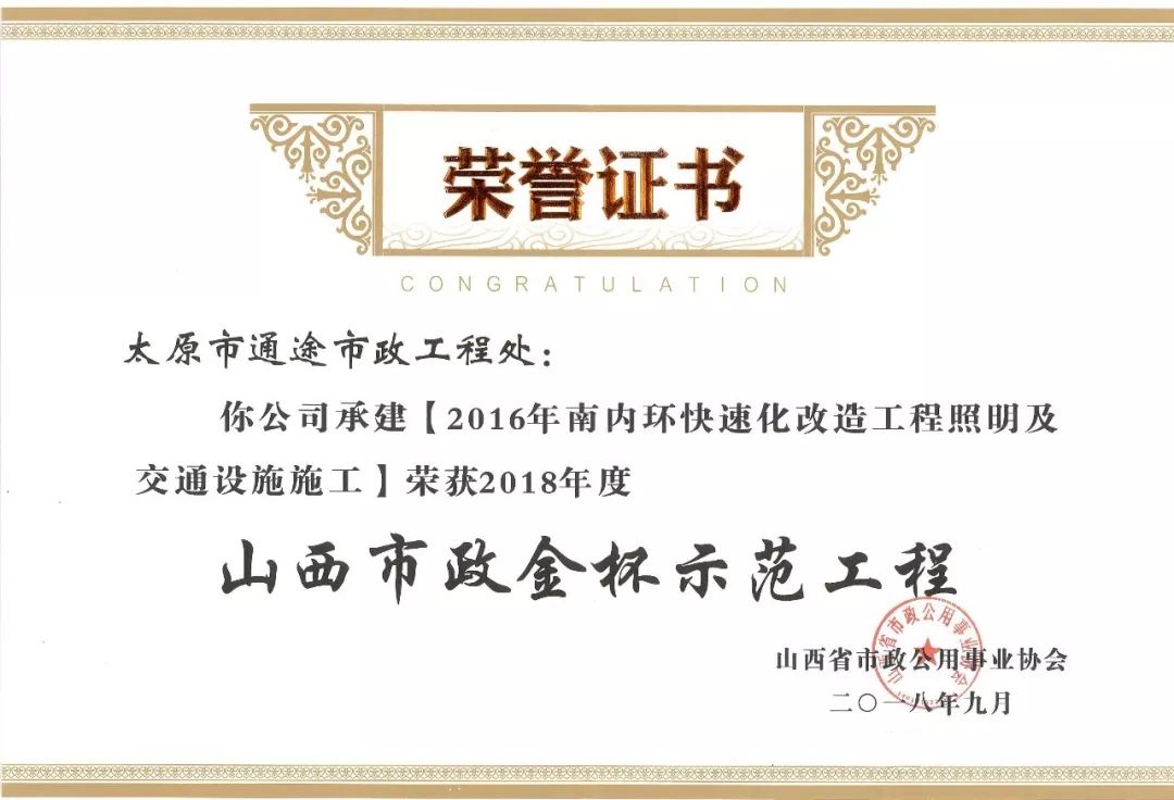 9月20日,通途市政工程處承建的南內(nèi)環(huán)快速化改造工程照明及交通設(shè)施施工、新晉祠路道路工程照明及交通設(shè)施施工榮獲山西省市政公用事業(yè)協(xié)會頒發(fā)的2018年度“山西市政金杯示范工程”榮譽(yù)稱號。