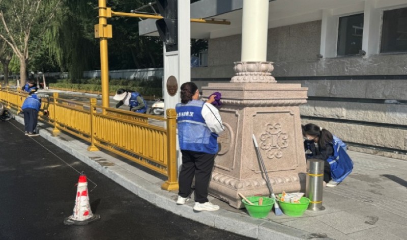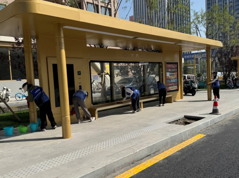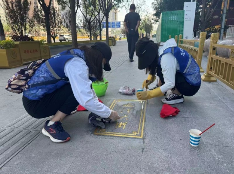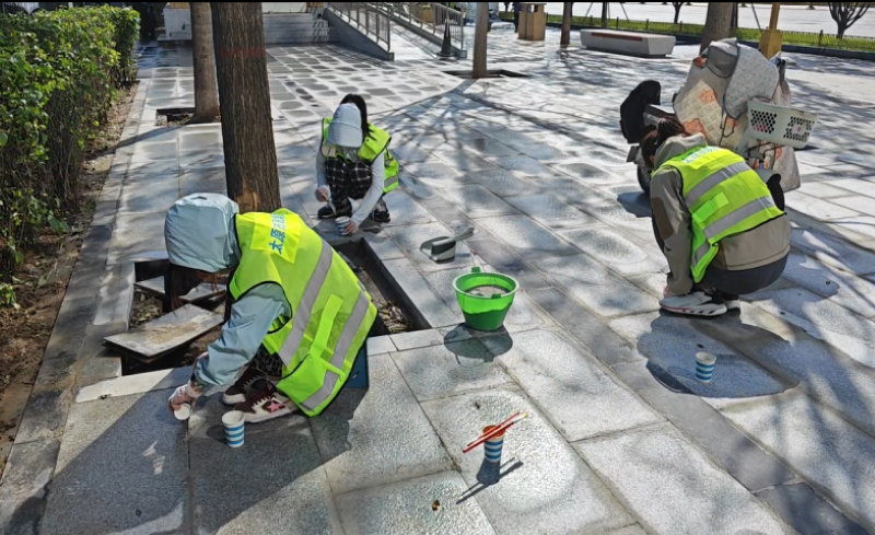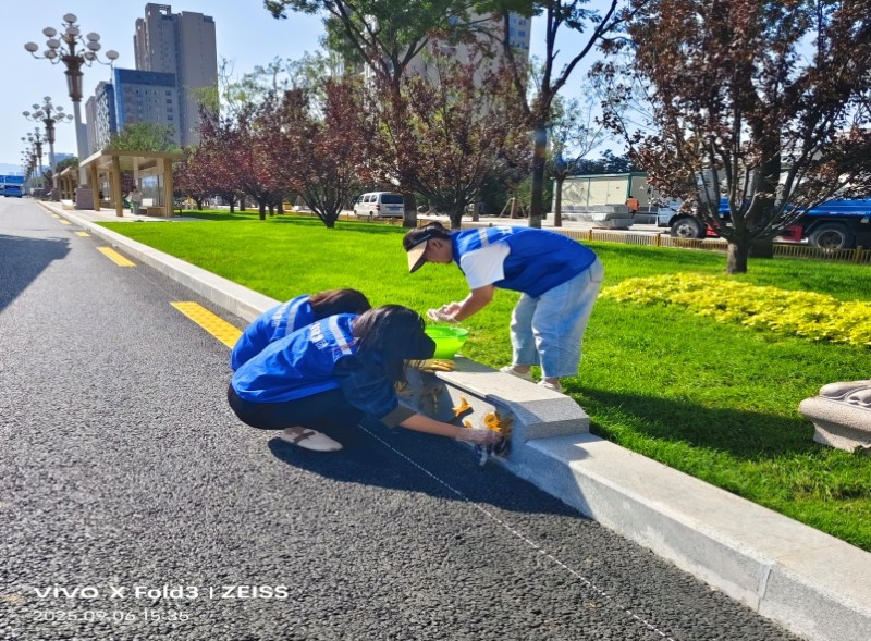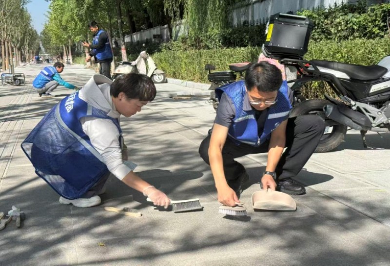 活動(dòng)自9月4日起為期六天,覆蓋迎澤大街(西段)全線,重點(diǎn)圍繞附屬設(shè)施清潔與道路精細(xì)化維護(hù)展開(kāi)?;顒?dòng)中,身著統(tǒng)一藍(lán)色“太原市政集團(tuán)”馬甲的志愿者們,手持長(zhǎng)柄擦洗器、水桶、抹布、鏟刀、掃帚等工具,對(duì)道路兩側(cè)公交站臺(tái)、路燈基地、護(hù)欄、照明燈桿等設(shè)施進(jìn)行系統(tǒng)清理與擦洗;同步推進(jìn)地磚灌縫精細(xì)化維護(hù)作業(yè),通過(guò)專(zhuān)業(yè)操作,確保每一條裂縫都“嚴(yán)絲合縫”,有效提升路面耐用性與通行舒適度,以實(shí)際行動(dòng)為市民出行安全與舒適保駕護(hù)航;同時(shí),志愿者專(zhuān)門(mén)對(duì)道路沿線的石頭字景觀展開(kāi)描金作業(yè),細(xì)刷蘸取金色涂料,一筆一畫(huà)精心描摹,成為主干道上一道兼具文化氣息與視覺(jué)美感的獨(dú)特風(fēng)景。