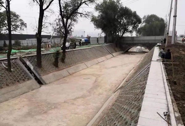 在施工中,由于市內(nèi)的壓頂磚供應(yīng)緊張,從市外運送又費時費力,給施工進(jìn)度造成了一定的影響,為加快施工進(jìn)度,項目部決定先進(jìn)行靠背、墊層等環(huán)節(jié)的施工,最后再進(jìn)行卡邊石的鑲嵌工序,這樣不僅合理安排了施工工序,還大大加快了施工進(jìn)度。同時,在作業(yè)面狹小的施工段,項目部不等不靠,安排80多名民建隊員同時進(jìn)行施工作業(yè),采取“人拉肩扛”的作業(yè)方式,全力推進(jìn)施工進(jìn)度。僅用時不到100天,項目部就完成了1800米的河道的清淤、底板澆筑、邊坡修整等工作任務(wù),主體工程全部完工,整個渠道“煥然一新”。