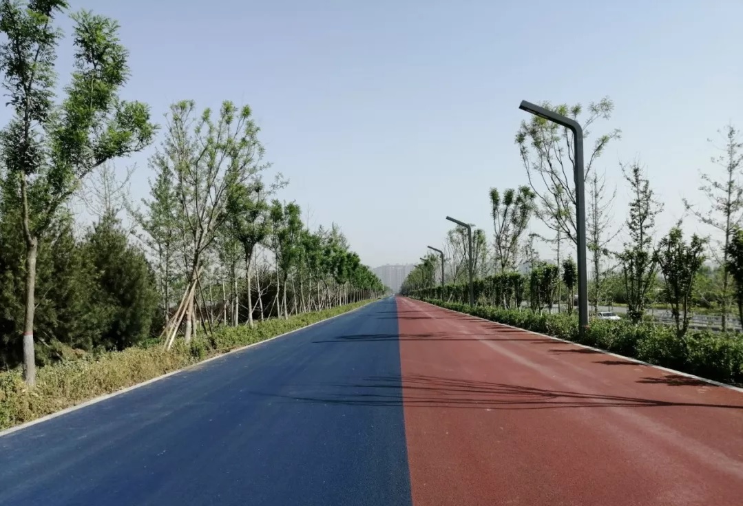 在道路鋪設(shè)過(guò)程中,為契合“二青”會(huì)體育精神,項(xiàng)目部在該工程面層鋪設(shè)彩色瀝青,不僅使路面更加干凈美觀,也為場(chǎng)館周邊道路增添一抹運(yùn)動(dòng)色彩。由于東大堤頂涉及國(guó)際自行車賽道,項(xiàng)目部制定可行性方案,在1、2號(hào)出入口施工中,采用墻端倒圓角處理,確保交通安全順暢。工程建設(shè)中,項(xiàng)目部全體參建人員不忘初心,堅(jiān)守使命,以熱情燃燒“卡路里”,助力品質(zhì)工程建設(shè)。