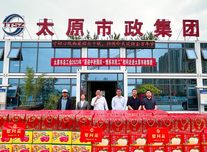 9月19日下午,太原市總工會(huì)黨組書記、副主席汪倫,太原市政府農(nóng)民工辦公室科長任俊峰一行來到集團(tuán)公司興華街周邊排水系統(tǒng)及道路園林景觀提標(biāo)改造工程二標(biāo)段施工現(xiàn)場開展“喜迎中秋國慶·情系農(nóng)民工”慰問活動(dòng),送來月餅、豬肉、水果等慰問品。太原市市政公共設(shè)施建設(shè)管理中心興華街項(xiàng)目負(fù)責(zé)人牛瑞浩,集團(tuán)公司黨委委員、紀(jì)委書記李茁,黨委委員、監(jiān)事會(huì)主席、工會(huì)主席馮忠參加了活動(dòng)。