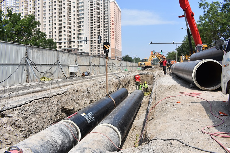 改造期間,項目部施工技術人員根據(jù)道路兩側(cè)預期規(guī)劃,提前制定了擴改方案,使用設計管徑為DN1000的供熱管道,為轄區(qū)內(nèi)的小區(qū)預留出供熱余量。由于該工程位于老城區(qū),地下管線尤為復雜,加之前期現(xiàn)狀管線資料不全,施工開始前,太原城市建設有限公司第五項目部的技術人員就提前做好溝槽的定位工作,采取整體放線、統(tǒng)一開挖的辦法,通過計算,提前讓熱力管道逐漸改變坡度,有效避開污水管道、燃氣管道等障礙物。同時,由于管道沿線區(qū)域地下水位高,施工人員根據(jù)現(xiàn)場實際情況,安裝了15個100毫米口徑的電動多級離心泵進行明排水施工,保證了施工進度。