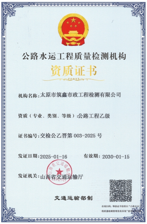近日,筑鑫公司成功獲得公路水運(yùn)工程質(zhì)量檢測(cè)機(jī)構(gòu)“公路工程乙級(jí)”資質(zhì)證書。此次資質(zhì)升級(jí),不僅是對(duì)筑鑫公司在公路工程檢測(cè)領(lǐng)域?qū)I(yè)實(shí)力的有力證明,更是其實(shí)現(xiàn)跨領(lǐng)域發(fā)展的重要里程碑,意味著下一步能夠?yàn)楣饭こ探ㄔO(shè)提供更多維度、更具專業(yè)性與精準(zhǔn)度的檢測(cè)服務(wù)。