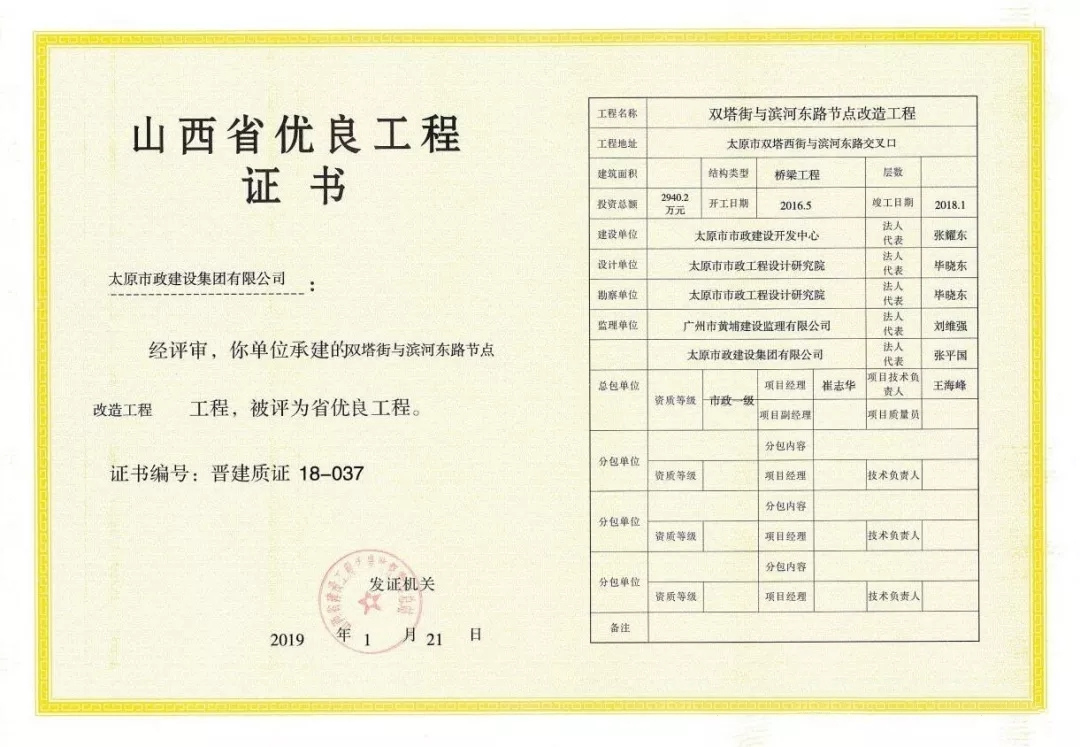 太原市政建設(shè)集團(tuán)有限公司雙塔街與濱河?xùn)|路節(jié)點(diǎn)改造工程榮獲“山西省優(yōu)良工程”榮譽(yù)稱(chēng)號(hào)