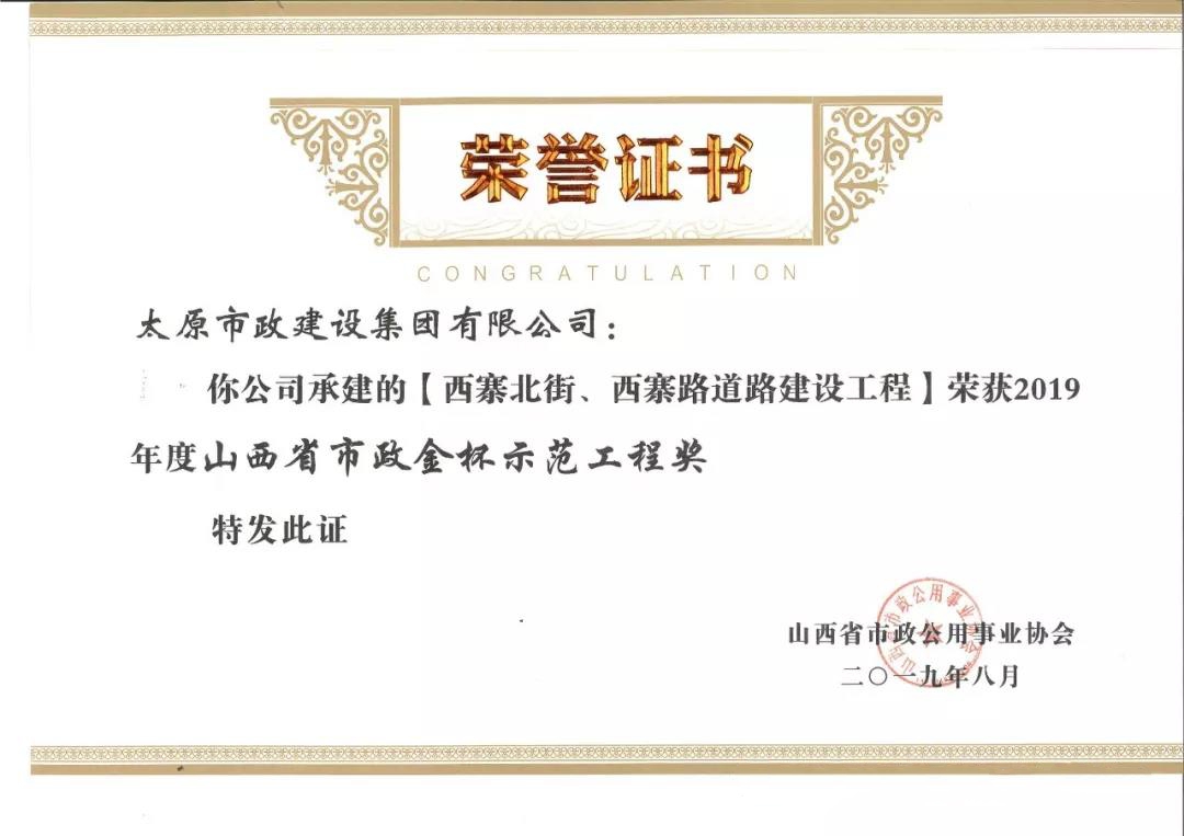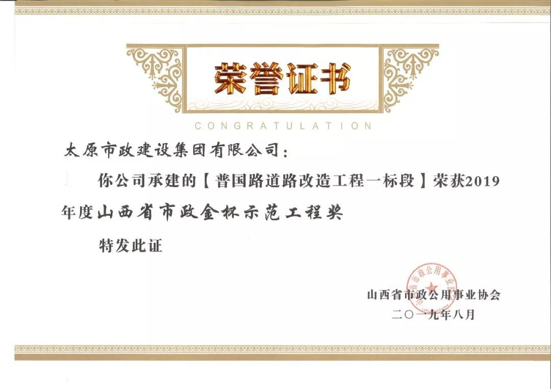 近日,太原市政建設(shè)集團(tuán)有限公司承建的太原市松小線建設(shè)工程,新晉祠路(長風(fēng)西大街-冶峪街)道路改造工程,臥虎山快速路建設(shè)工程一標(biāo)段工程,普國路道路改造工程一標(biāo)段,西寨北街、西寨路道路建設(shè)工程榮獲山西省市政公用事業(yè)協(xié)會頒發(fā)的2019年度“山西省市政金杯示范工程”榮譽(yù)稱號。集團(tuán)公司王愛蓮、劉桂英、李瑞金、閆玲、王根和榮獲2019年度“山西市政工程優(yōu)秀項目經(jīng)理”榮譽(yù)稱號。