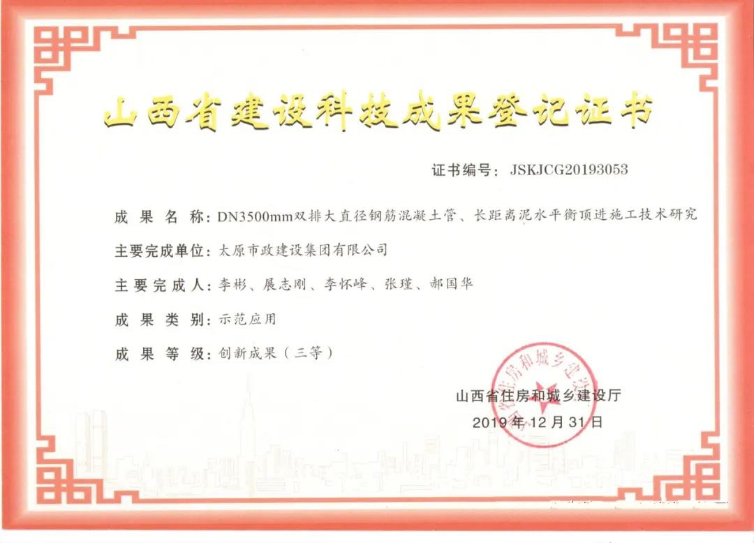 近日,集團(tuán)公司申報的《DND3500mm雙排大直徑鋼筋混凝土管、長距離泥水平衡頂進(jìn)施工技術(shù)研究》被山西省住房和城鄉(xiāng)建設(shè)廳評為創(chuàng)新成果(三等)。