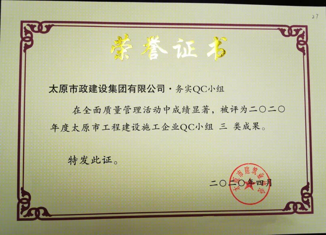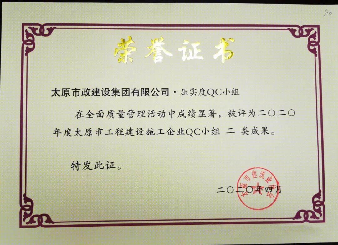 4月10日,集團(tuán)公司壓實度QC小組的《濕陷性粉土壓實度控制》,被太原市建筑施工協(xié)會評為2020年度太原市工程建設(shè)施工企業(yè) QC小組二類成果;集團(tuán)公司務(wù)實QC小組的《提高檢查井旁人行道磚的觀感質(zhì)量》,被太原市建筑施工協(xié)會評為2020年度太原市工程建設(shè)施工企業(yè) QC小組三類成果。