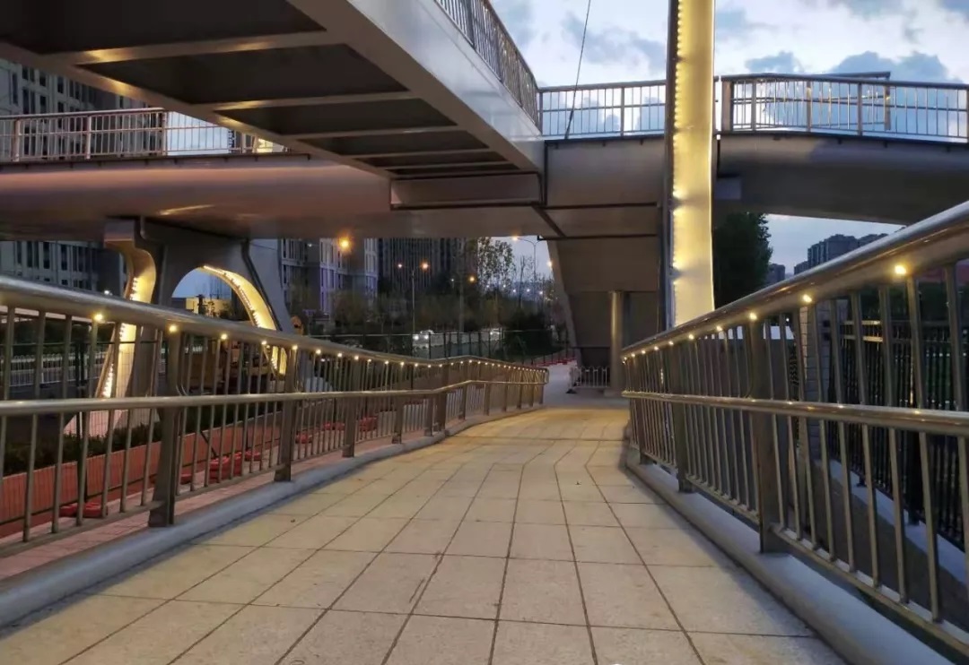 該工程為橋梁結(jié)構(gòu),采用連續(xù)梁加塔索裝飾鋼板梁,需在主橋兩側(cè)設(shè)梯道和無障礙坡道欄桿扶手內(nèi)設(shè)置LED點光源,并在塔凹槽內(nèi)近機動車道處安裝條形LED洗墻燈。