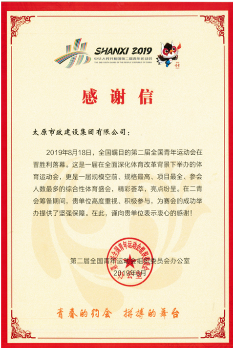 太原市政建設(shè)集團有限公司收到第二屆全國青年運動會組織委員會感謝信