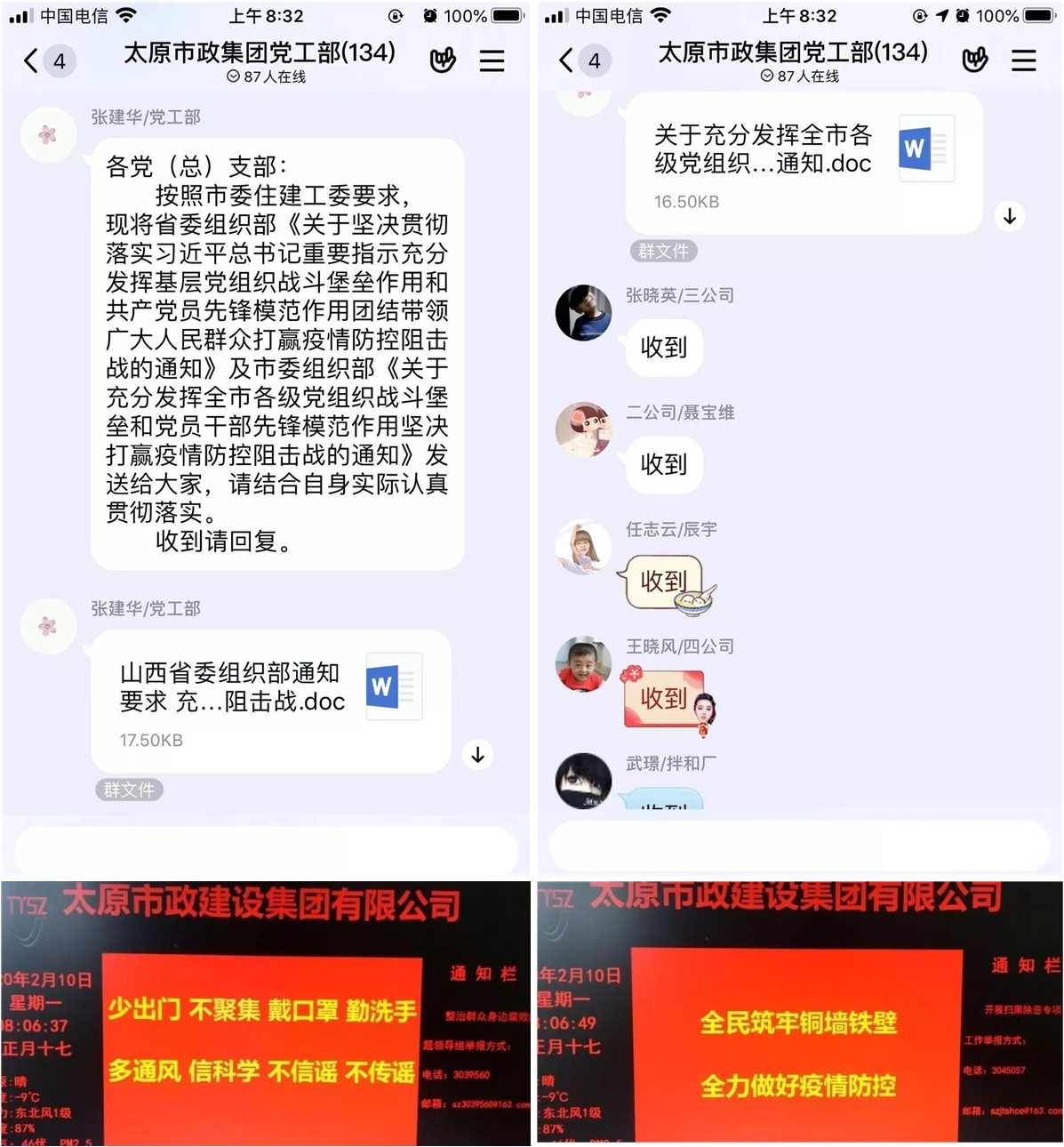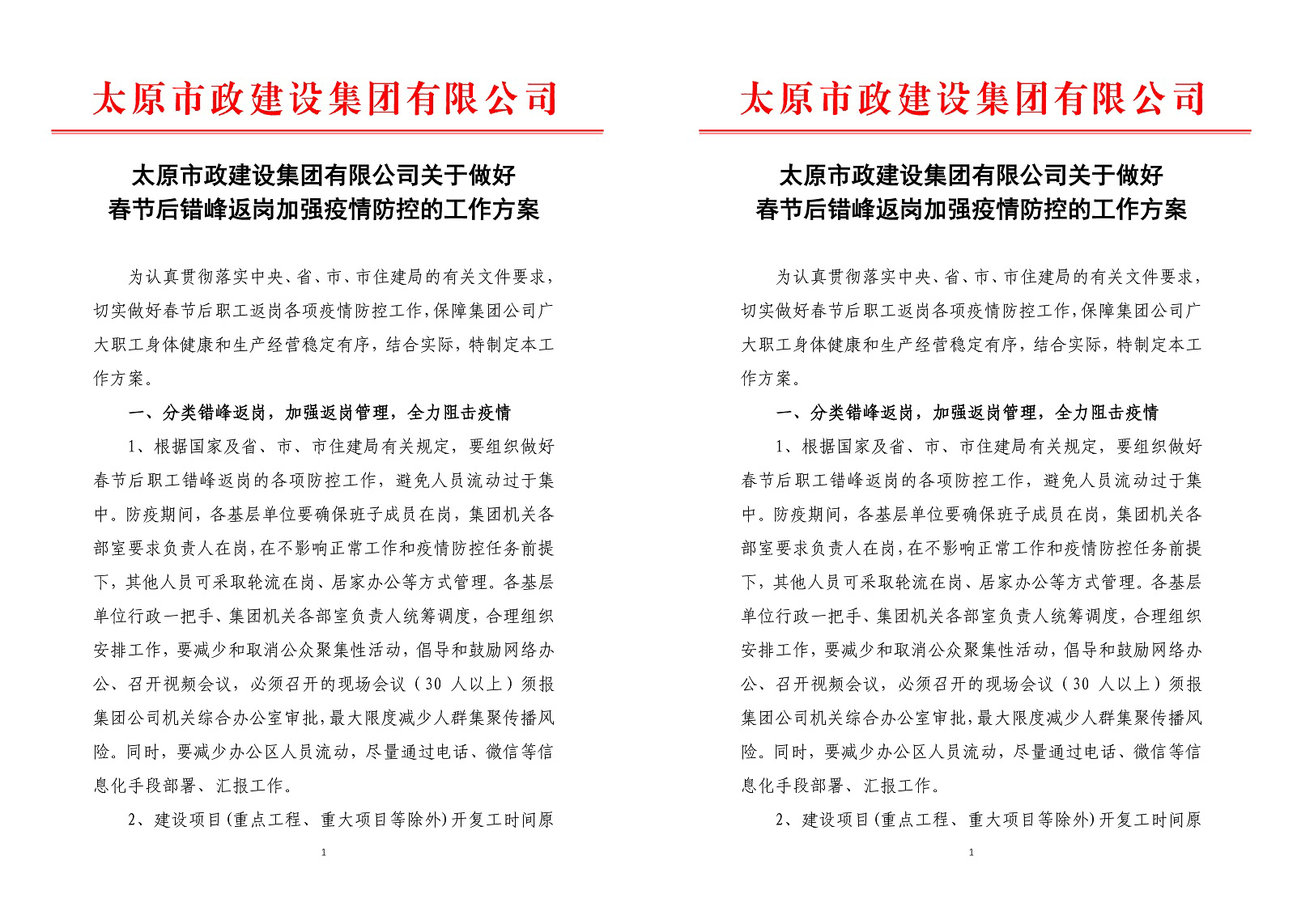 統(tǒng)一指揮,確保領(lǐng)導(dǎo)組織到位。為有效應(yīng)對新冠肺炎疫情,集團公司迅速制定《太原市政建設(shè)集團有限公司新型冠狀病毒防控應(yīng)急預(yù)案》,成立集團公司新型冠狀病毒感染的肺炎疫情防控工作領(lǐng)導(dǎo)小組,以強有力的領(lǐng)導(dǎo)統(tǒng)籌協(xié)調(diào)推進集團公司疫情防范和處置工作。同時,集團公司制定《太原市政建設(shè)集團有限公司關(guān)于做好春節(jié)后錯峰返崗加強疫情防控的工作方案》,對職工復(fù)工前以及返程中個人防護、網(wǎng)上辦公等事項作出詳細安排和明確要求,保障集團公司廣大職工身體健康和生產(chǎn)經(jīng)營穩(wěn)定有序。